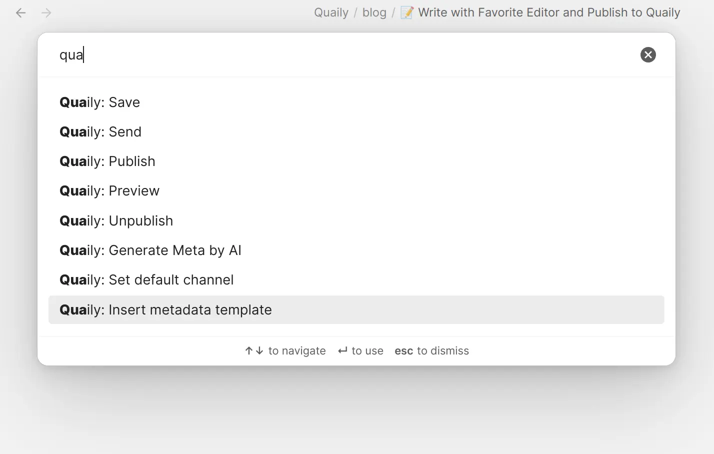 为了方便使用,Quaily 的 Obsidian 插件提供了一些快捷命令,可以在 Obsidian 的命令面板中使用。