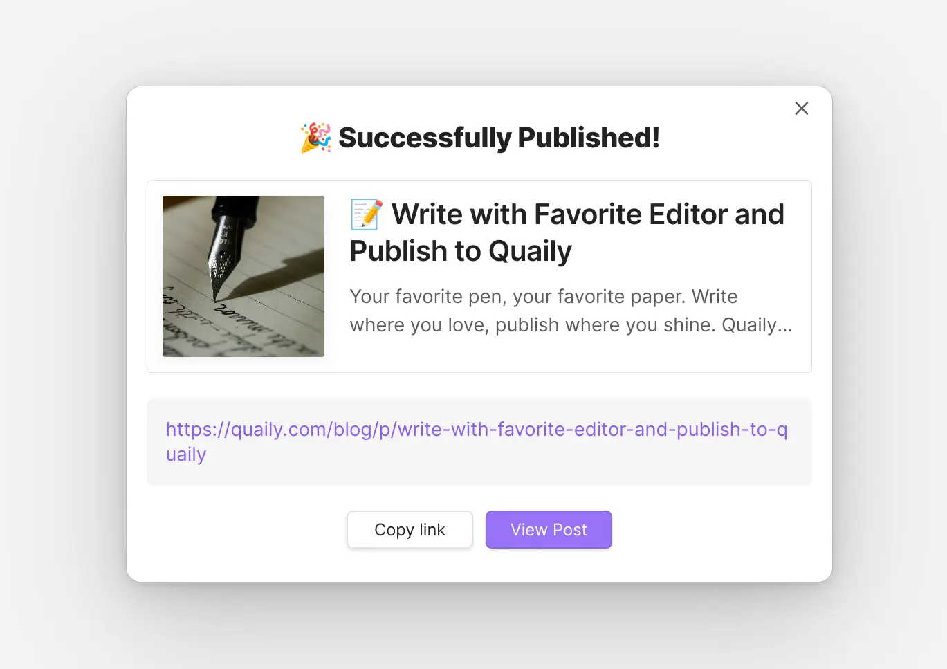 - Quaily 将会弹出一个对话框,显示文章的访问地址。可以点击地址,查看文章,或者点击「复制」按钮,将地址复制到剪贴板。